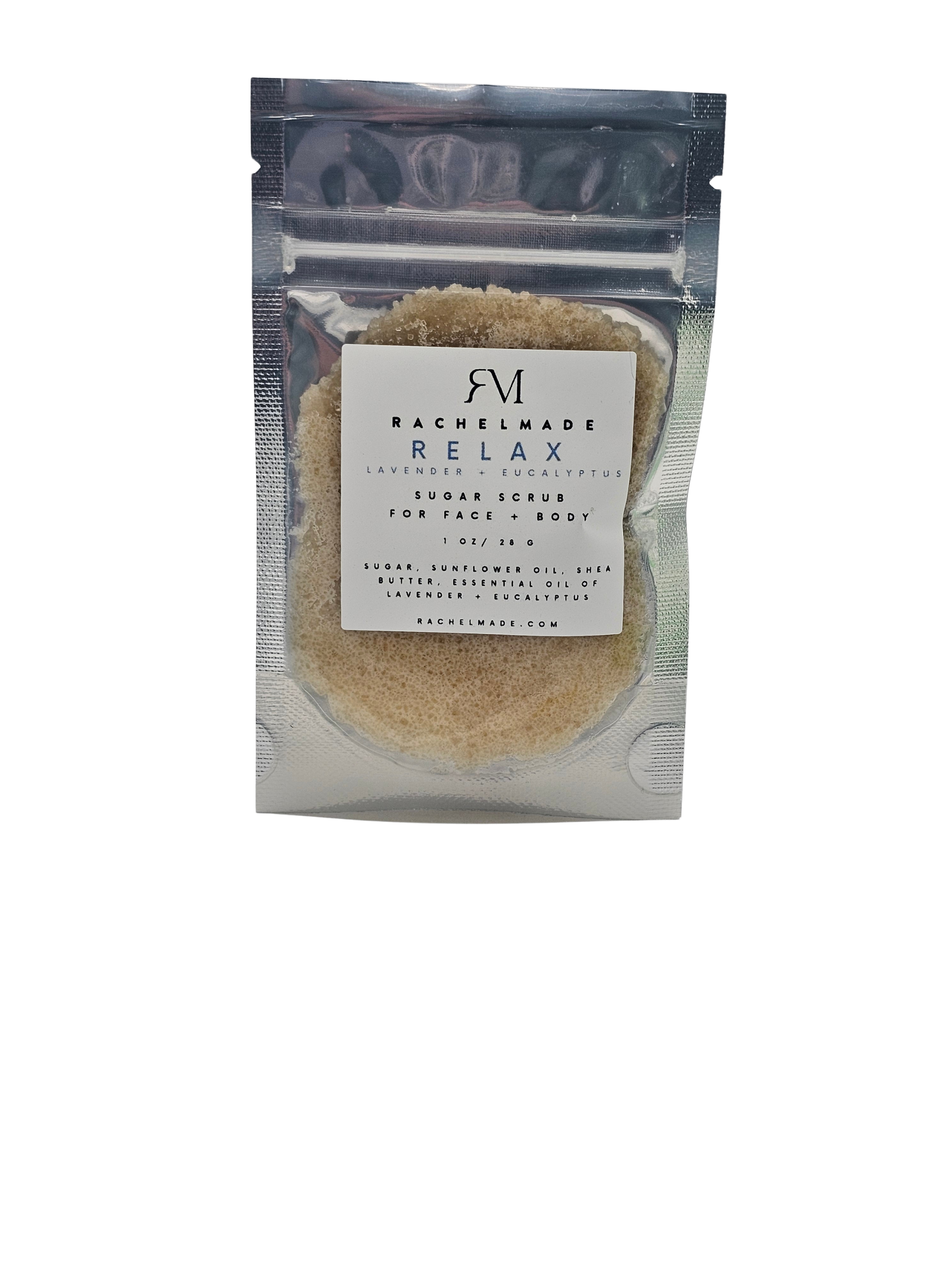 RachelMade RELAX scrub takes you right to the spa with soothing aromas of Lavender and Eucalyptus while you scrub your stresses (and your dry skin) away!